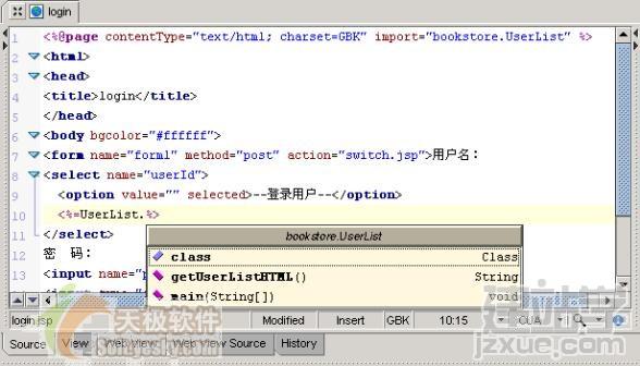 通过表达式标签替换原静态的HTML代码,值得提起的是,在JSP中也可以象在编写一般的Java类中一样使用CodeInsight输入代码。调整后的login.jsp的代码如下所示,用粗体表示: