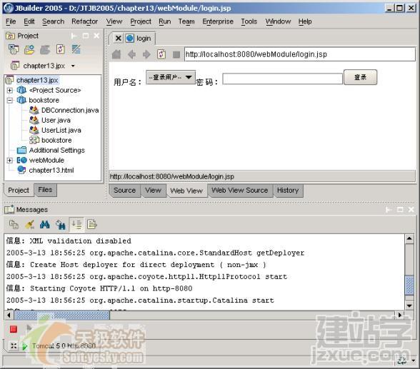 保存login.jsp后,在内容窗格login.jsp文件标签中点击右键,选择Web Run using Defaults,JBuilder 将启动Tomcat 5.0应用服务器,运行于8080端口上,编译并运行login.jsp文件,如下图所示:
