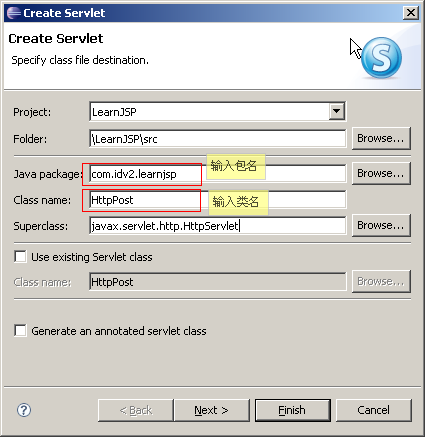 按照下图的样子,在Java package处输入包名 com.idv2.learnjsp,在 Class name处输入类名 HttpPost,单击Next。