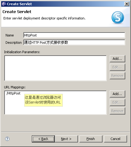 出现Servlet映射的配置界面,输入适当的Description。注意下方的 URL Mappings,这个就是从浏览器访问该Servlet时使用的URL。