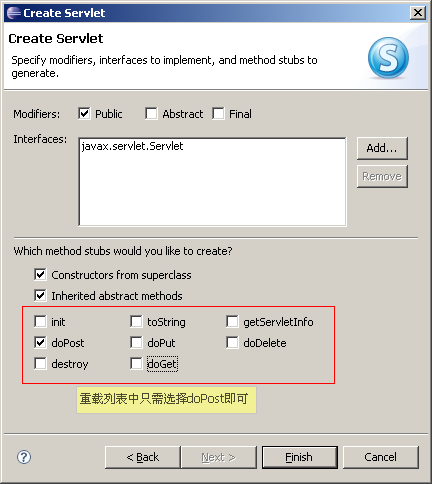 下一步选择新建的类的属性,通常选择默认即可。 不过我们的Servlet只需要处理POST方法,所以下方的重载列表中只需选择doPost即可。