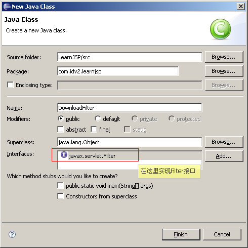 创建Filter时可惜不能像Servlet那样,直接从右键菜单中选择新建, 而只能先写好源代码然后手工添加到web.xml中。 如下图,在新建类时注意要实现javax.servlet.Filter接口。
