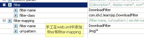 写完代码之后,打开web.xml文件,手工添加Filter。与Servlet类似,你需要添加 和 两个标记。这里我们要对 /img/ 下的所有文件进行登录验证, 因此的 url-pattern 处我们填写了 /img/* 。