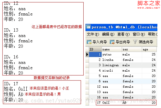 现在发现,当提交的数据中含有中文(比如变量姓名的值为中文)时,mysql_insert.jsp页面上显示新增的那条记录中的相应中文(姓名的值)乱码,其他数据都显示正常,查看数据库,发现也是相应的含有中文的变量值(姓名的值)乱码。乱码情况如下图: