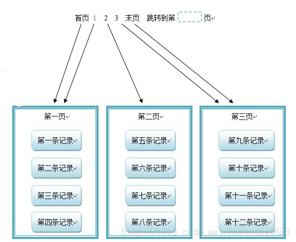 如果想要把页面显示做成这样的效果,在这张图中pageSize=4,pageCount=3,showPage=1,recordCount=12。思路是,如果要显示那个页面,就要先算出来每个页面第一条记录是所有记录中的第几条记录,假设每页的第一条记录是总记录中的第position条记录,那么position=(ShowPage - 1)×PageSize+1。比如上图这个例子,如果要显示第一页,就要计算出第一页中的第一条记录是总的记录中的第一条记录;如果要显示第二页,就要计算出第二页中的第一条记录是总的记录中的第四条记录;如果要显示第三页,就要计算出第一页中的第一条记录是总的记录中的第九条记录。