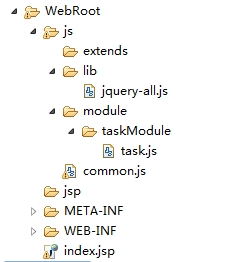 解释一下:js主要包括extends(引入第三方的js)、module(项目模块自己的js)、lib(引用包,这里也可以继续拆分),module中包含具体的模块中的js。common.js是核心命名空间的js.