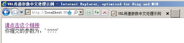 上面这个JSP程序的功能就是通过一个URL链接向自身传递一个参数,这个参数是中文字符串,这个程序的运行效果如下图