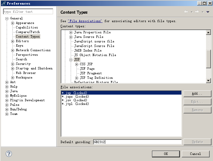 对于这个问题我们只需要更改一下Eclipse或者是MyEclipse中对JSP的默认编码就可以了,修改的地方(我的MyEclipse版本为11)如图所示