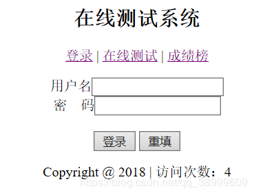 <center> <h2>在线测试系统</h2> <p> <a href="Index.jsp" rel="external nofollow" >登录</a> | <a href="test.jsp" rel="external nofollow" >在线测试</a> | <a href="scorelist.jsp" rel="external nofollow" >成绩榜</a> </p> </center>