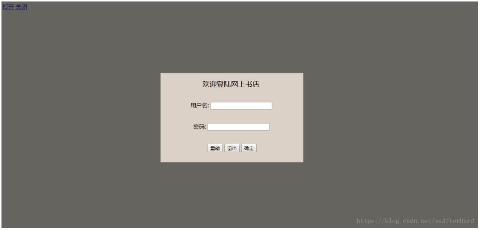<div id="win" class="win" style="display:none"> <form action="javascript:jump();" method="post"> <span style="font-size: 20px;"> 欢迎登陆网上书店 </span> <br /> <label class="label"> 用户名: </label> <input type="text" class="input" id="user" /> <br /> <label class="label"> 密码: </label> <input type="password" class="input" id="psw" /> <br /> <input type="reset" value="重输" class="input1" /> <input type="button" value="退出" class="input3" onclick="closeLogin();" /> <input type="submit" value="确定" class="input2" /> </form> </div> <a href="javascript:openLogin();" >打开</a> <a href="javascript:closeLogin();" >关闭</a>