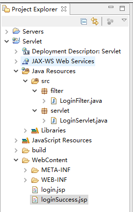 1.新建一个Dynamic Web Project项目,里面新建1个filter文件、1个servlet文件和2个jsp文件,整体的框架如图所示: