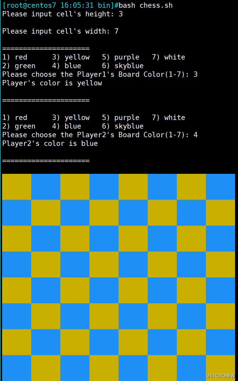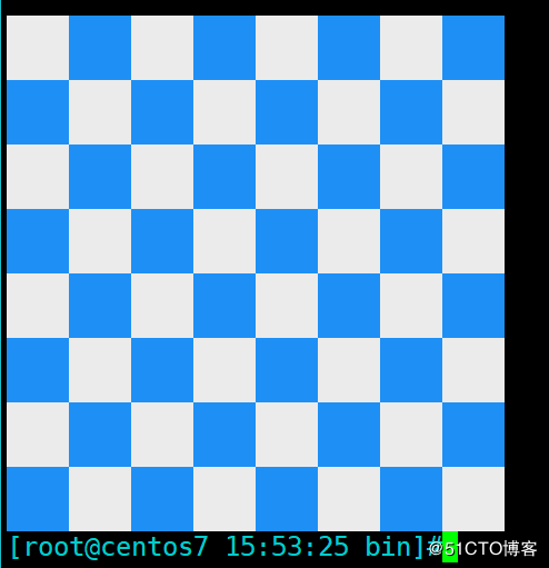 其中变量COL1是棋盘的第一种颜色,变量WI是棋盘单个格子的宽度。高度则带入给变量赋值后当作循环的次数。注意这里的宽度/高度最小单元是一个光标的宽度和高度。