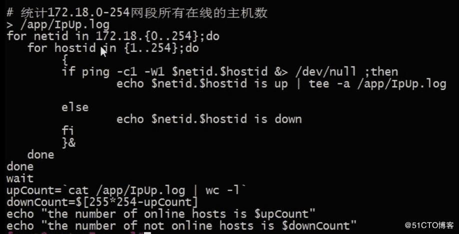 #!/bin/bash #Author:wangjun #Contact QQ:183530300 #Version:1.0 #Create time:2016-08-17 11:25:37 #Description:ping all hosts and count the number declare -i online=0 declare -i offline=0 declare -i host=1 for host in `seq 254`;do ping -c 1 -W 1 10.1.250.$host &> /dev/null && echo "10.1.250.$host is online" && let online=$online+1 || let offline++ done echo "Online hosts number : $online" echo "Offline hosts number : $offline"