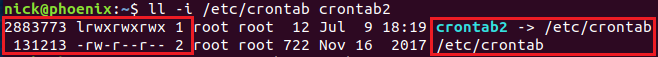 $ ll -i /etc/crontab 131213 -rw-r--r-- 1 root root 722 Nov 16 2017 /etc/crontab