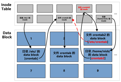 从上图我们可以看出,软链接文件 crontab2 是一个实实在在的文件,有自己的 inode 和 data block。但是它的 data block 中保存的是目标文件的地址:/etc/crontab。 像 open() 这样的 API 能够识别出软链接,并根据 data block 中的目标文件径把操作重定向到目标文件上。