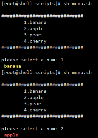 cat<<-EOF =============================== 1.banana 2.apple 3.pear 4.cherry =============================== EOF