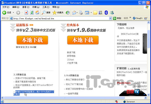 另外,目前大部分专注于下载领域的软件,针对用户遇到的这种问题都提供了相应的解决方案,比如快车下载软件,就在它最新的FlashGet2.3版本中指出了“新增BT文件校验算法,减少99%完成不了的情况”更新功能,如图4所示。这种更新的实质就是:将在本文之前介绍的那些解决办法的思路都融入了自己的版本更新中,使得用户在使用专门的下载软件下载资源时,不知不觉中就避免了“99%下载门”的影响。这也算得上是最好最便捷的一种化解办法了。