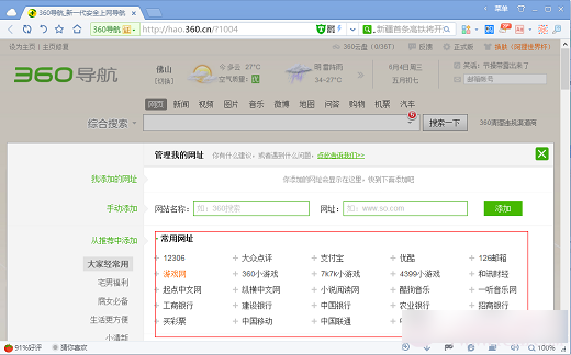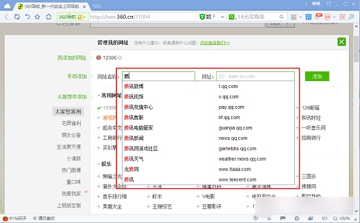 二、在“管理我的网址”窗口中选择下面360提供的网站点击添加即可