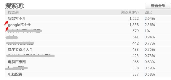 目前像大家常访问的google.com以及google.com.hk均无法正常访问,并且有大量网友遇到此问题,最近几天,每天有几千网友搜索此问题,而且这些仅仅只是进入电脑脚本之家人群,实际在搜索这个问题的问题,要多的多,因此笔者可以断定,目前有大量网友电脑无法打开谷歌搜索。如下图所示,网友搜索进入脚本之家“google打不开”数据。