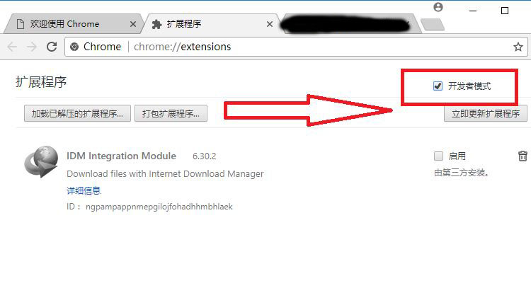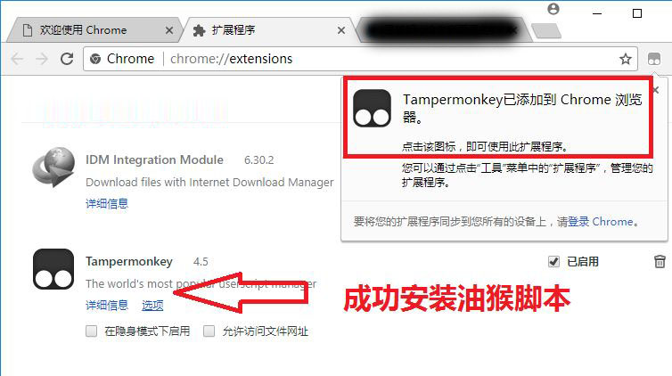 5、打开“开发者模式”后再次把 油猴脚本Tampermonkey 离线安装包Crx文件 拖进谷歌浏览器