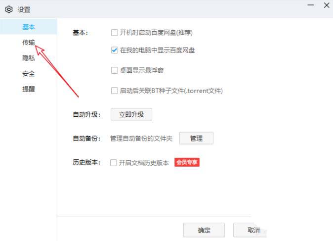 2、打开设置窗口后,点击左侧的传输