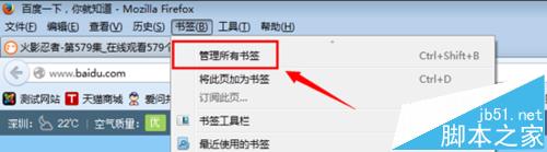 1、打开firefox浏览器,找到菜单栏(如果没有菜单栏到空白处右键调出吧)如下图,点击“管理所有书签”