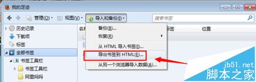 2、出现的书签管理器找到,找到“导入和备份”功能如箭头位置