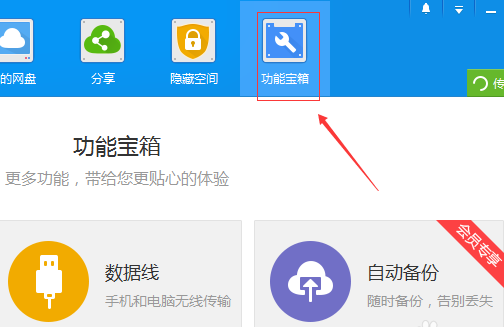 1、我们点击电脑端百度云盘快捷方式,登录与手机云盘一样的账号,登录进入电脑端百度云盘页面以后,我们在最上面找到“功能宝箱”并点进去。