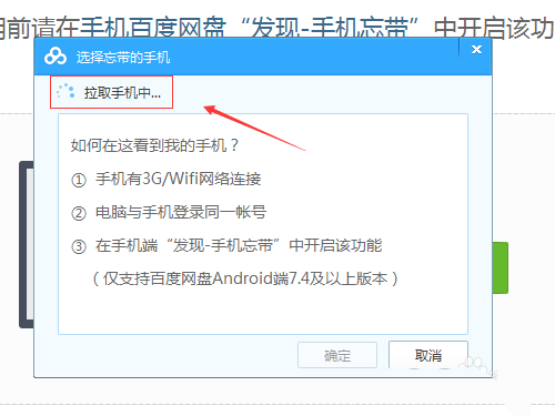 使用“手机忘带”功能需要满足三个条件:手机有3G/wifi网络连接。电脑与手机登录同一百度云账号。在手机端开启“手机忘带”功能。另外,该功能仅支持百度网盘Android端7.4及以上版本。