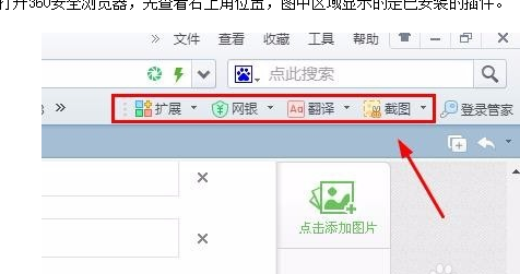 首先当然是打开360浏览器,先查看右上角位置,图中区域显示的是已安装的插件。
