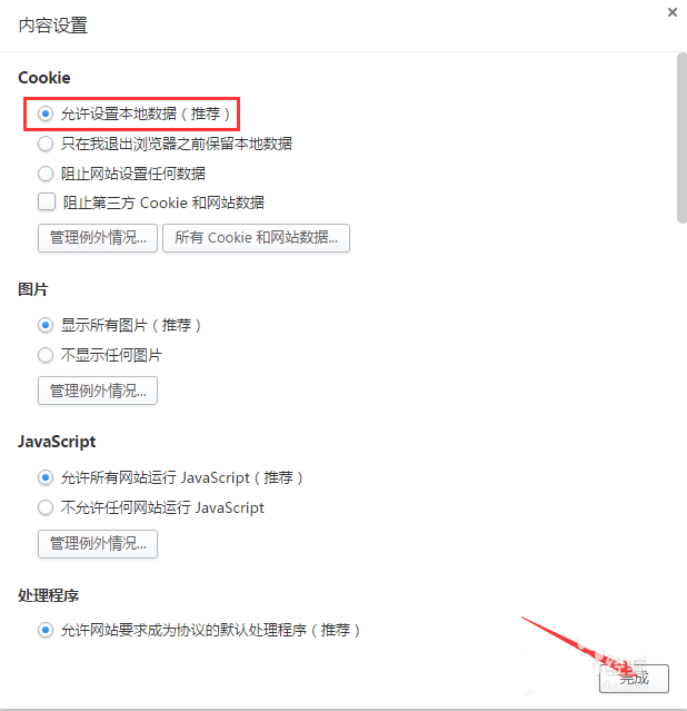 6、完成上步骤后,进入如下页面,在第一项中就是Cookie,选择红色圈出选项即可完成Cookie的开启。
