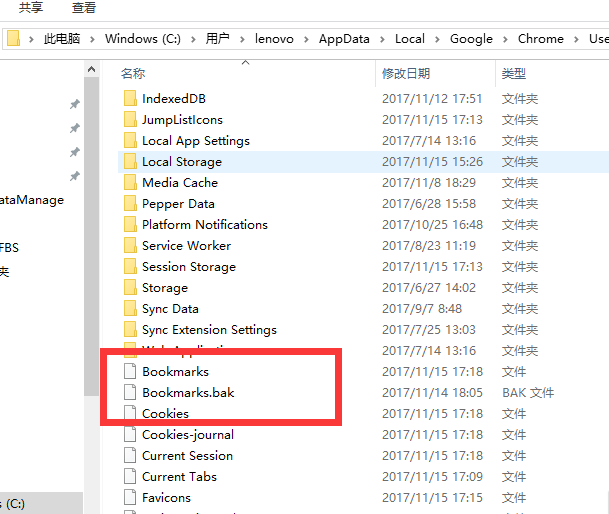 6、可看到如下文件夹,删除Bookmarks文件