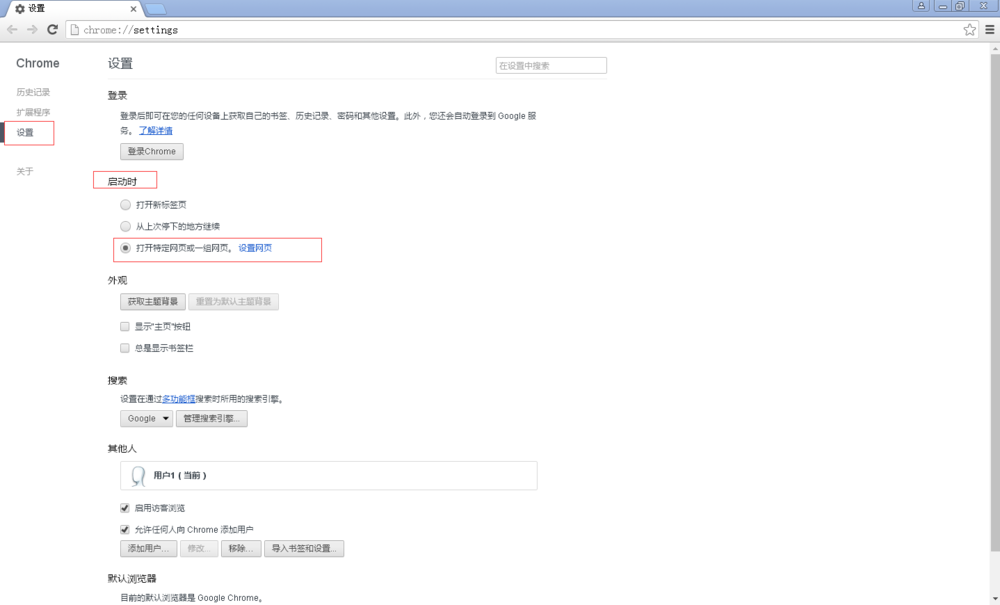 Google浏览器安装完后,默认打开的为新的标签页面,我们可以通过设置,让浏览器默认打开自己喜欢的页面,我们还可以通过以下方法设置: