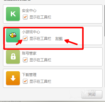 5、点击以后,我们找到我们玩的这个游戏的按钮,我们可以点击前面的对勾,不让显示,也可以直接卸载掉。