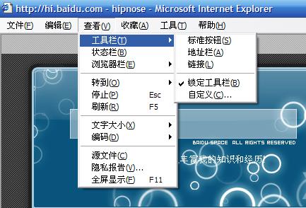 3.接着点击查看>工具栏,如下图将“标准按钮”、“地址栏”、“链接”前面的勾都去掉