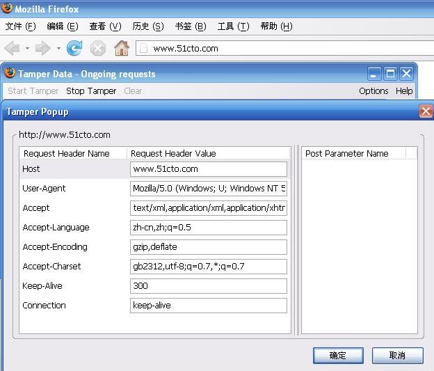 点击率“Tamper”之后,会出现下面的窗口。可以看到,窗口的顶部,显示当前被截获的 HTTP 请求,左边窗口显示的是浏览器发出的 HTTP 请求的头部各字段,右边窗口显示的是浏览器发出的 HTTP 请求的 POST 参数。在这两个窗口里面,我们可以修改浏览器提交的 HTTP 请求头部字段/POST 参数,删除某些 浏览器提交的 HTTP 请求头部字段/POST 参数,或者添加其他合法的 HTTP 请求头部字段/POST 参数。很强大吧?