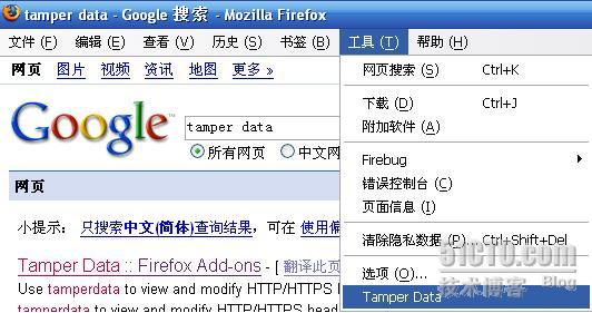第三步:安装完后后,可以在 Firefox 菜单栏的“工具”菜单项里面找到 Tamper Data,如下图所示: