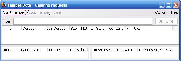 点击 Firefox 菜单栏上“工具”菜单项里面的“Tamper Data”,就会弹出 Tamper Data 的主窗口,如下图所示:
