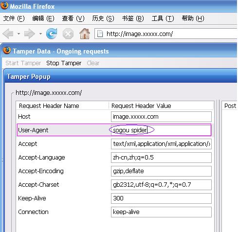 下面是测试我们配置的防恶意浏览器访问。在下面的窗口,修改浏览器提交的 User-Agent 字段,将其设置为我们禁止的恶意访问浏览器之一,比如 sogou spider,点击“OK”提交后,发现我们的请求被禁止了,可见我们的配置是正确的。