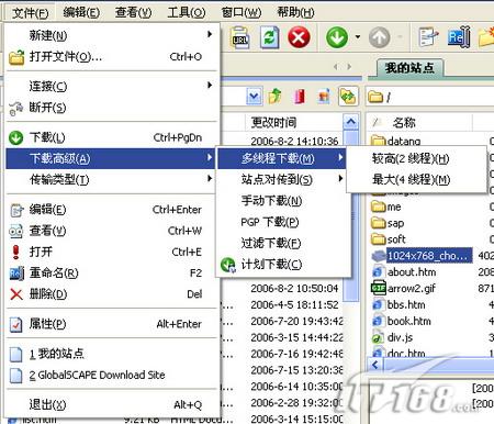 使用CuteFTP来下载文件,并不是大家想的那样普通,其实软件的高级下载模式还内有乾坤。选择所需文件,点击菜单“文件”→“下载高级”,大家可以看到若干子选项,其中“多线程下载”、“站点对传到”值得关注,如图15。