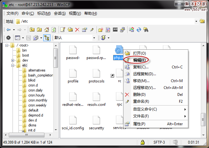这里以编辑/etc/php.ini为例演示通过WinSCP编辑文本文件的过程。