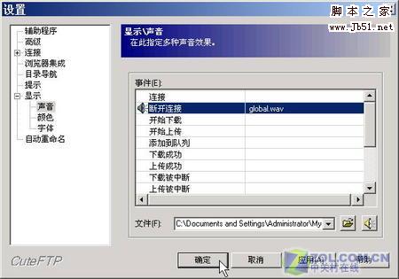 2.选择“编辑”→“设置”,在打开的窗口中单击“显示”下的“声音”项,再选择相应的事件,然后单击相应事件。再在窗口下方选择相应的声音,或者单击“打开”按钮选择相应的WAV声音即可(如图5)。这样当我们连接服务器、断开连接、开始下载、出现疑问或开始上传时就会有相应的声音来提醒我们。