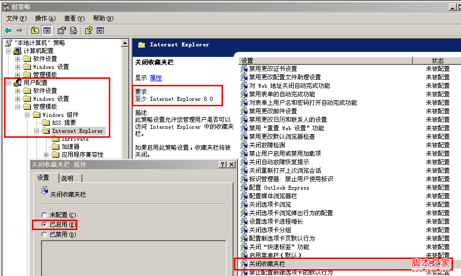 前段时间突然某软件开始劫持IE8的收藏夹,看着真别扭,搞来搞去搞不掉,今天突然想到之前用过组策略禁止修改IE主页,于是就试着找了下果然有关闭收藏夹的,启用后也有效,自己试下吧~