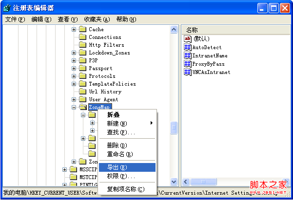 4)在窗口空白处单击鼠标右键,并在弹出的右键菜单中选择“导出”,将ZoneMap和Zones项下的全部键值另存为一个注册表文件。