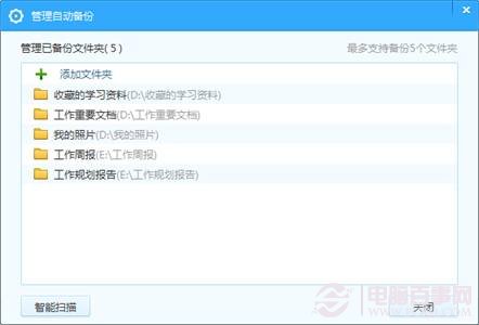 2)如果系统关联文件不是您想自动备份的文件夹,您可以选择手动添加自动备份文件操作如下:点击百度云管家右上角的【设置】--【管理自动备份文件夹】【添加文件夹】选中需要的文件夹,然后点击【备份到云端】最后【关闭】,云管家就会自动将文件夹里面的内容备份到云端。