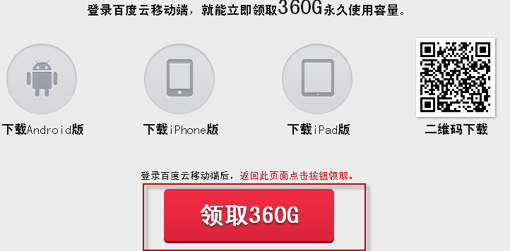 登录百度云移动端,就能立即领取360G永久使用容量。
