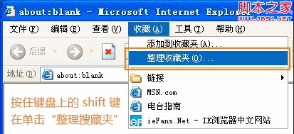 1.单击菜单栏上面的“搜藏夹”,按住键盘上的 shift 键以后在单击“整理收藏夹”,便可快速打开搜藏夹所在的文件夹。