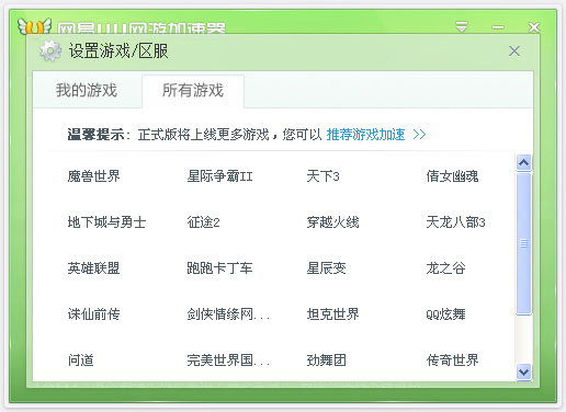 初次使用的用户,可以在身份验证成功以后,通过界面上“选择游戏加速”按钮打开游戏列表。已经使用过网易UU的用户,可以通过主界面上的更换游戏/区分按钮选择新的游戏。