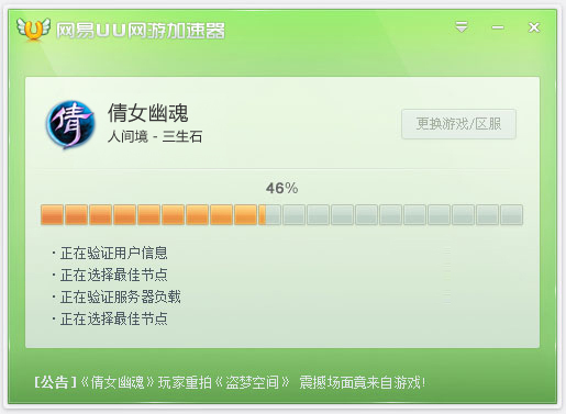 当您选定了游戏和区服以后,网易UU直接进入加速过程。已经使用过UU加速器的用户,开启软件后会显示前一次加速的游戏。