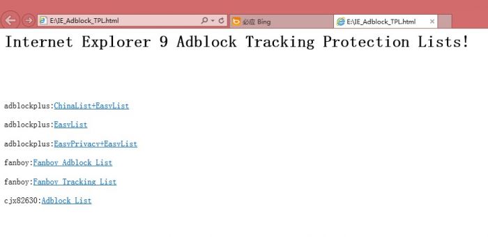 Add TPL: <a href="javascript:window.external.msAddTrackingProtectionList('http://easylist-msie.adblockplus.org/chinalist+easylist.tpl','ChinaList+EasyList')">ChinaList+EasyList</a>